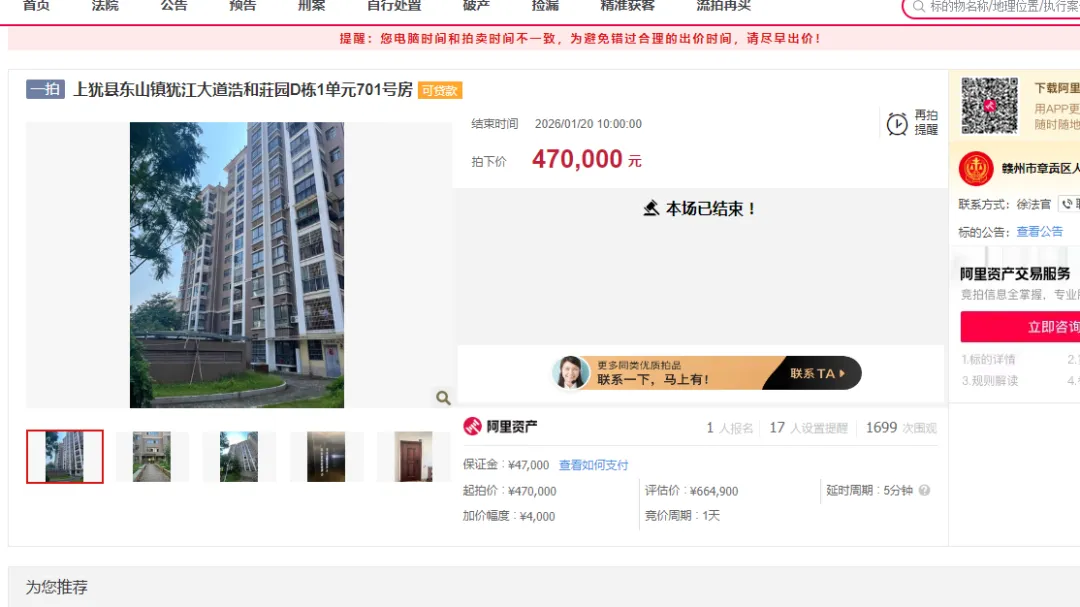 赣州市章贡区人民法院于2026年1月19日10时至1月20日10时,在淘宝司法拍卖平台对上犹县东山镇犹江大道浩和莊园D栋1单元701号房进行公开拍卖。该房产权证号为01B0030574号,建筑年份2012年,登记时间2015年,登记建筑面积116.45平方米,房屋位于总高13层的第7层,框架结构。拍卖依据为(2025)赣0702执3436号之一执行裁定书,起拍价470,000元,保证金47,000元,增价幅度4,000元。竞买号P4999以470,000元最高应价成功竞得该房产。来源:阿里拍卖