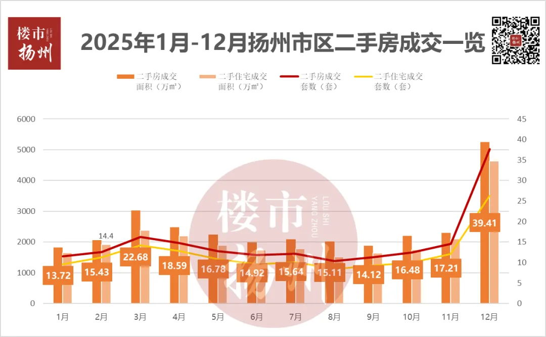 2025年1月1日-12月31日,扬州市区(不含江都区)二手房成交24146套,成交总建面约222.34万㎡;成交面积环比2024年增加约27.06万㎡,环比上涨约13.86%。