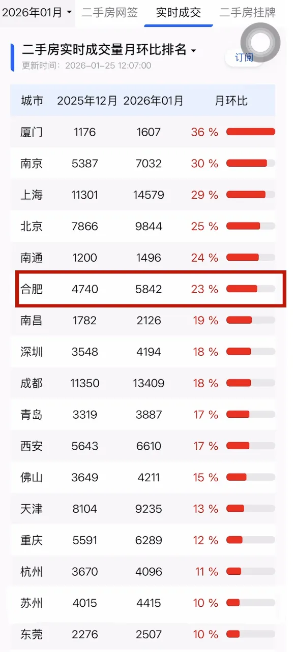 再看下环比涨幅,全国上涨的18城中,合肥涨幅23%,位列第六,排名第一的是厦门,涨幅36%。