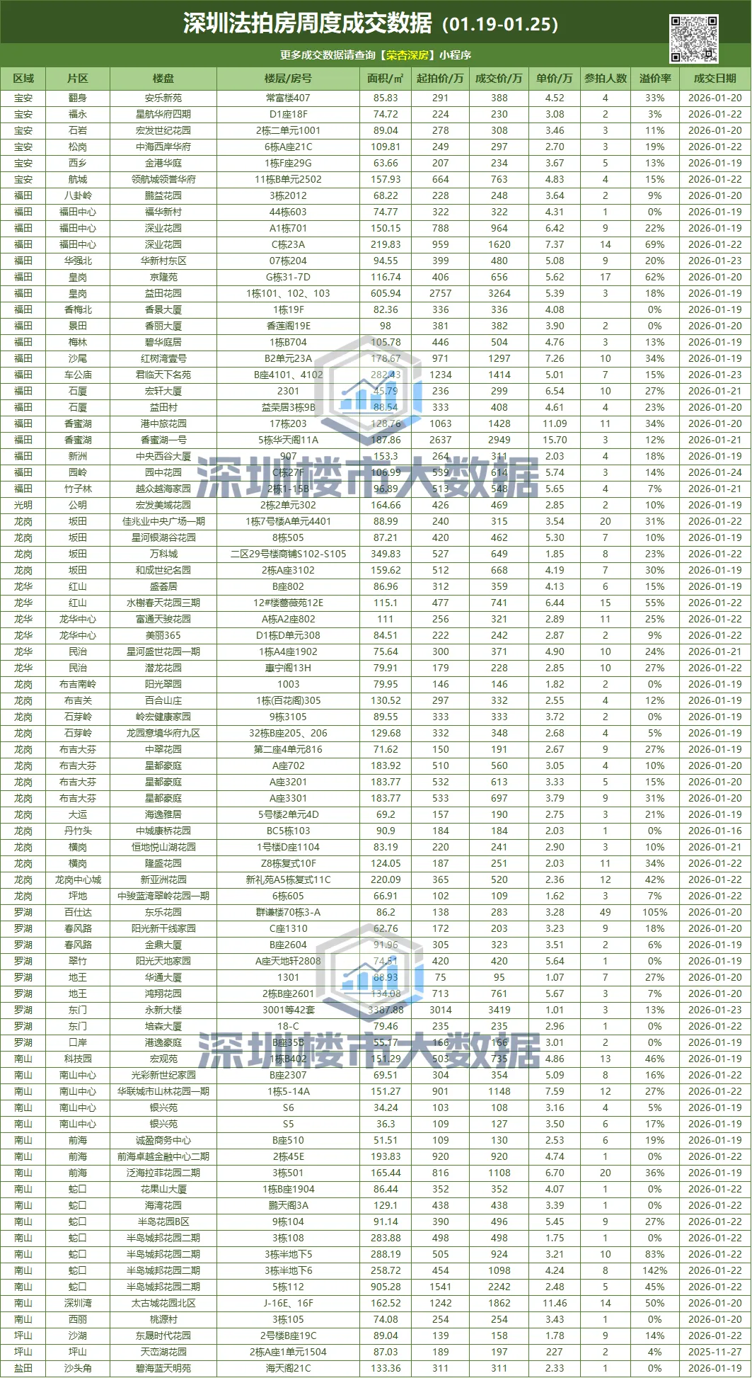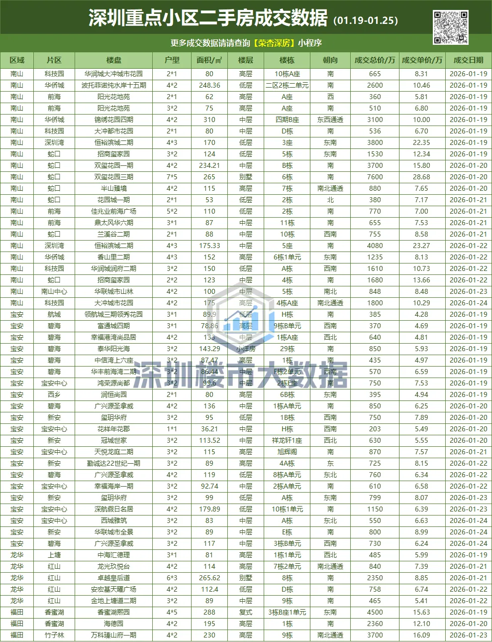 我们定期发布深圳全市各区二手房成交数据,本次统计周期为:2026.01.19-01.25