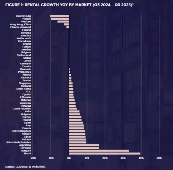 2025年,美国商业地产市场虽仍维持着一定规模的增长,但增速明显放缓,且全年呈现“前弱后冷”的态势。从市场规模来看,尽管经济复苏、城市化进程的持续推进以及科技驱动的新型商业模式兴起,为商业地产市场注入了一定活力,然而,高企的利率、日益严格的环保法规、电商冲击下的业态转型压力,再叠加关税提升、移民限制收紧等新增因素,共同限制了市场的扩张步伐。根据相关数据统计,2025年美国商业地产开发行业的市场规模达到8900亿美元,较前一年增长 2.3%,增速明显放缓,凸显市场低迷态势。其中,工业地产建设量下滑最为明显,据高力国际数据,自2022年以来工业建设量已下降 63%,创下近年新低。据穆迪为CNBC提供的独家月度数据显示,2025年11月商业地产交易量同比下降10%,总交易仅1800笔,甚至低于2020年11月新冠疫情初期的水平,反映出市场流动性的持续收紧。穆迪商业地产资本市场调研负责人凯文·法根(Kevin Fagan)指出,长期利率高企、政策不确定性、劳动力市场的脆弱以及商业地产贷款人和投资者的谨慎态度,共同导致了 2025 年下半年商业地产交易的低迷。供应端,新项目开发虽然依旧活跃,但新增供应量受限,且建设节奏受多重因素拖累。一方面,土地成本不断攀升,尤其是在核心城市,高昂的土地出让金使得开发商拿地成本大幅增加;另一方面,严格的审批流程拉长了项目开发周期,可持续性标准的提升也要求开发商在项目设计与建设过程中,采用更多环保材料与节能技术,进一步增加了开发难度与成本。需求端,结构变化显著且分化加剧。远程办公的常态化,使办公空间需求持续萎缩。许多企业为降低运营成本,纷纷削减办公面积,或采用灵活办公模式,减少对传统写字楼的依赖。高力国际的调查显示,2025年美国写字楼的空置率达到19.2%,创近年来新高,且部分办公物业出现大幅折扣交易。例如纽约曼哈顿西41街114号在降价53%之后才得以出售给对冲基金Axonic Capital。零售商业空间也面临困境,电商的持续冲击改变了消费者的购物习惯,传统实体零售的客流量与销售额双双下滑,对零售地产的需求随之减少。全球主要国家和地区的零售物业租赁价格按年增长率(数据&图源:戴德梁行)
