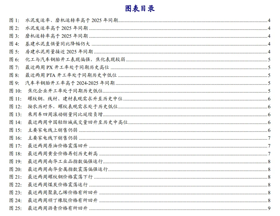 1.建筑开工:开工率季节性位置整体回升。最近两周(1 月 11 日至 1 月 24 日),水泥发运率、磨机运转率高于 2025 年同期,石油沥青装置开工率处于同期历史低位。基建项目水泥直供量同比降幅仍大,房建水泥用量则接近 2025 年同期。资金方面,2026 开年建筑工地资金到位率同比低于 2025 年同期。