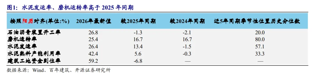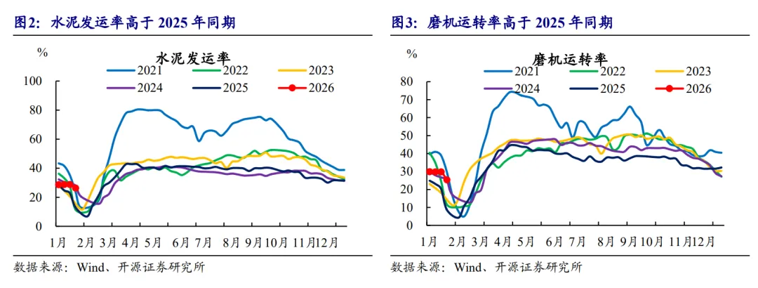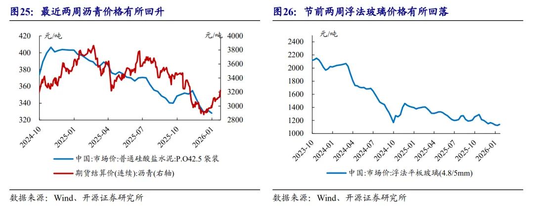 最近两周(1月11日至1月24日),水泥发运率、磨机运转率高于 2025 年同期,石油沥青装置开工率处于同期历史低位。基建项目水泥直供量同比降幅仍大,房建水泥用量则接近 2025 年同期。资金方面,2026 开年建筑工地资金到位率同比低于2025 年同期。