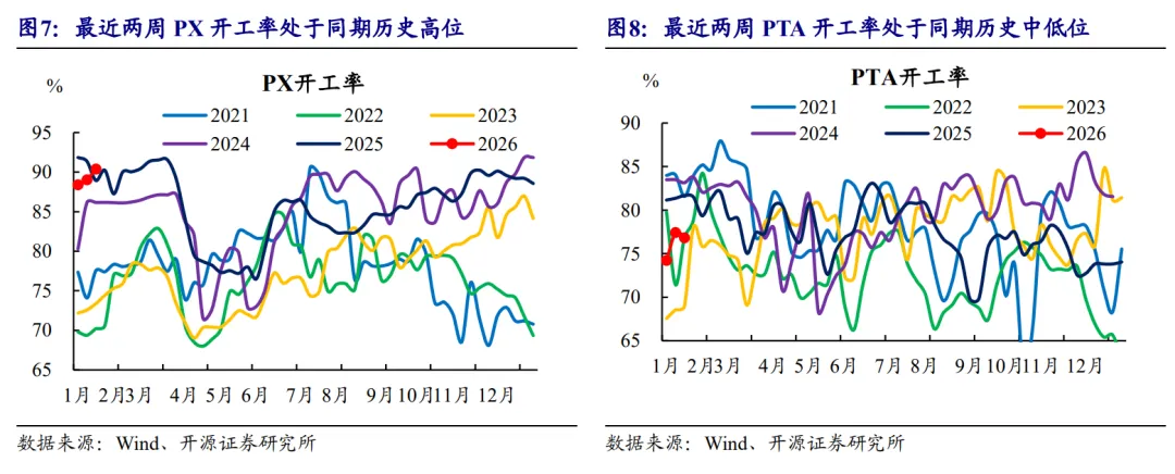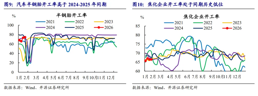 最近两周(1月11日至1月24日),工业开工出现分化,化工与汽车钢胎开工表现偏强,焦化表现较弱。化工链中 PX 开工率维持历史高位,PTA 开工率处于历史中低位,汽车钢胎开工率处于同期历史中高位,焦化企业开工率降至历史低位。