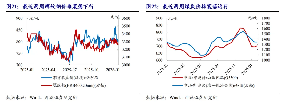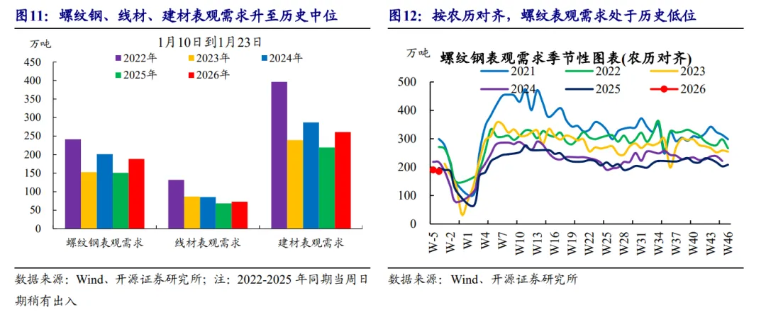 建筑需求仍弱,最近两周(1月10日至1月23日),螺纹钢、线材、建材表观需求升至历史中位,受春节错位影响较大,按农历对齐,螺纹钢需求低于历史同期。