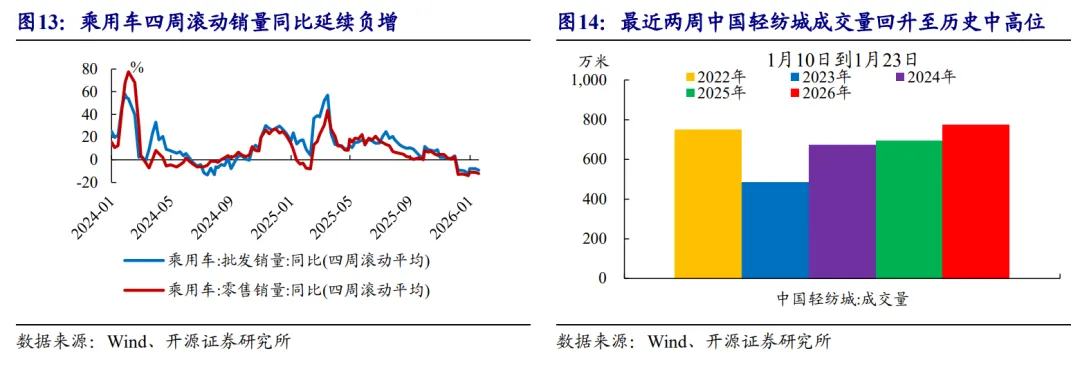 汽车销量延续弱势。最近两周(1月11日至1月24日),乘用车四周滚动销量同比延续负增。最近两周(1月10日至1月23日),中国轻纺城成交量回升至历史中高位。