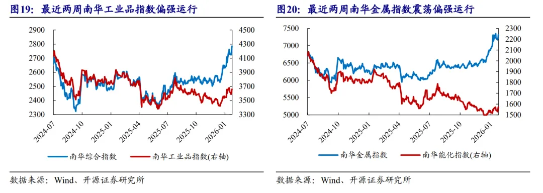 2.国内工业品:有色带动国内工业品价格震荡偏强运行。最近两周(1 月 12 日至1 月 25 日),国内定价工业品价格震荡上行,南华工业品指数震荡偏强运行,主要由有色金属带动。细分品种下,最近两周螺纹钢价格震荡下行,煤炭价格震荡运行;化工链产品价格涨多跌少,建材产品沥青上涨,玻璃下跌。