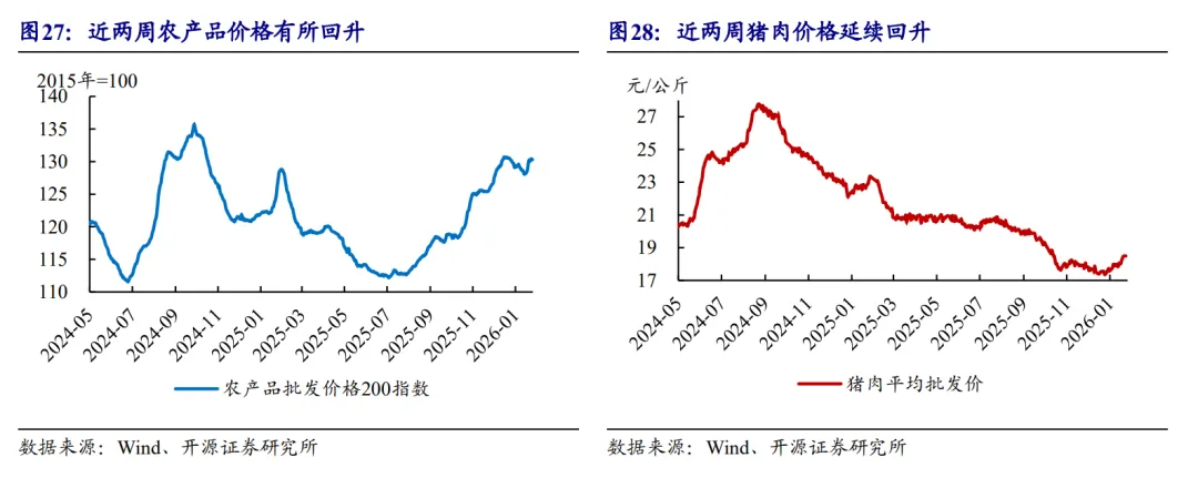 最近两周(12月19日至1月12日),农产品价格有所回升,猪肉价格延续回升。