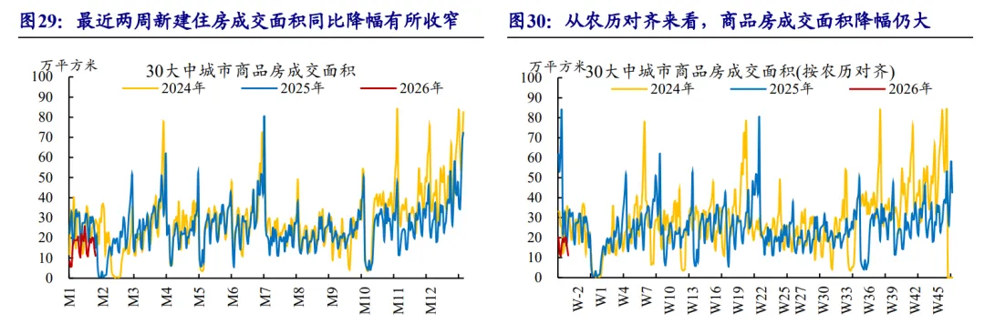 最近两周(1月12日至1月25日),全国 30 大中城市商品房成交面积平均值环比-28%,较 2024、2025 年同期分别变动-29%、-31%,降幅有所收窄,但从农历对齐来看,降幅仍大。一线城市成交面积较 2024、2025 年同期分别变动-28%、-26%。