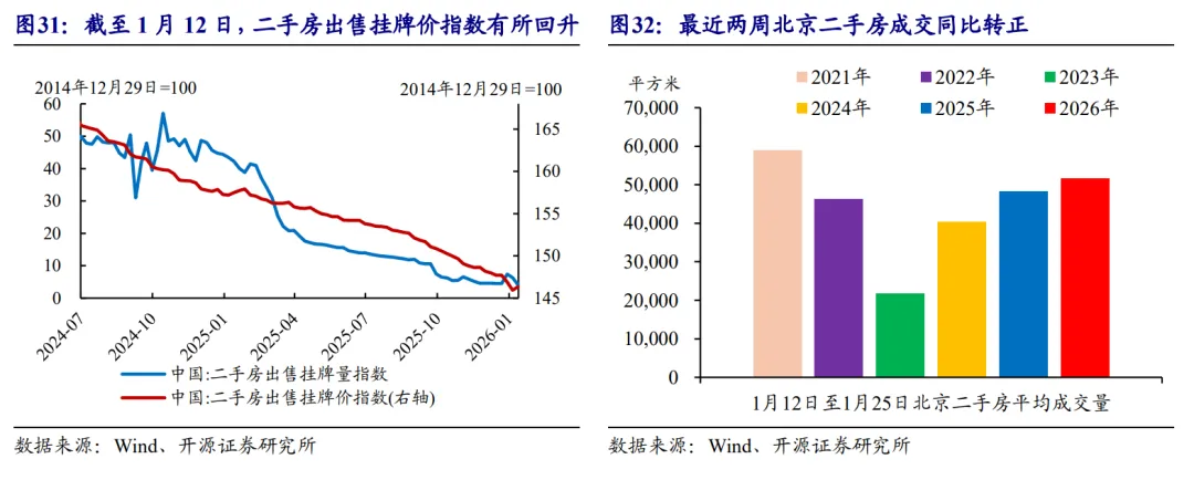 2.二手房:量价齐升。价格方面,截至 1 月 12 日,二手房出售挂牌价指数环比有所回升;成交量方面,开年以来(1 月 12 日至 1 月 25 日),北京、上海、深圳二手房成交同比均转正,较 2025 年同期分别同比+7%、+5%、+21%;农历对齐下,二手房成交同比仍为正。