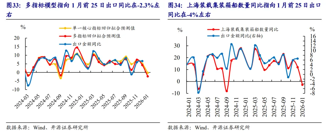 多指标模型指向 1 月前 25 日出口同比-2.3%左右;而不考虑模型的上海装载集装箱船数量同比指向 1 月前 25 日出口同比在-4%左右。