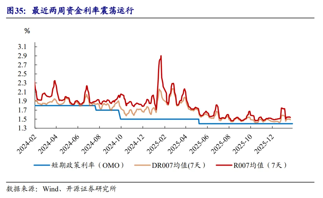 最近两周(1月12日至1月25日),资金利率震荡运行,截至 1 月 23 日,R007为 1.54%,DR007 为 1.49%。DR007 近 7 天中枢为 1.49%,略高于 1 月均值。