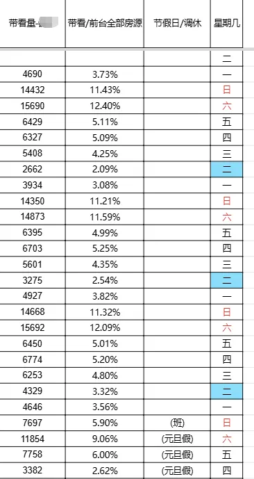 跟老婆解释清楚了这个数据字段的逻辑,那么的确是从可见在售量是减少了,但环比来看没有断崖式、踩踏式等式,归结为“逐渐、陆续、渐渐”为妥;还是那句话,的确库存往下走了,对卖家业主是个促进,简单说就是有人不卖了或者卖出去的多了,新增上来的少了,你的竞争压力减少了,(但今天不展开多说,因为还有价格这个问题还要参考哦)。 2、回题,那么在售量少了,带看量是不是应该多了?或者说房子少了看房的也少了呢?A/带看量的波动,核心受 “时间因素” 驱动,而非在售量;B/在售量影响的是 “带看的集中度”,而非 “带看总量”。(库存小幅下降,不会让市场上的看房人数变多 —— 因为看房的客群总量,是由政策预期、信贷成本、置换需求决定的。)但库存减少会带来一个关键变化:优质房源的带看集中度会提升。带看量同样因小绿的占有率综合较强,我也用的小绿的做底层分析。元旦那3天因为假期、调休问题不管,通过公式 带看量/在售房源量 得出一个指数逻辑,百分比越大说明房子被看的机会越大,也就是说展现率吧举例,10套房子 10组带看量 10/10=100%,不用较真,因为10套里可能1套就被10组看过,另外9套没人看,所以这个指数代表的是展现概率,用于整体宏观面的判断热度与否。周六日,有6天底层数据,得出的指数均值11.67%周2经纪人既定休息日,所以工作人员休息,带看量肯定少。全部的数据不便全部展示,但结论是 每个周二、每个周六日、以及工作日指数相对各自的环比差异极小。所以在售量从1日到26日的13减到12.5的库存跟带看量之间的一个逻辑,并没有实际很大的影响。个人经验+数据分析 分享,没有任何引导方向,只希望通过相对客观的实际情况,大家做到认知提升上来,别一个什么V什么神 一个忽悠 就觉得了不得了 给赶紧卖 赶紧买,左右不了市场,那就客观的了解市场,以至于了解你自己到底要什么!