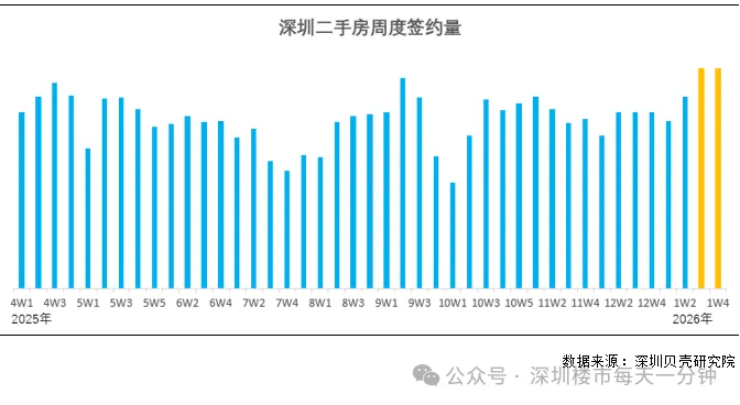 据深圳贝壳研究院统计,1月1日至1月25日,贝壳深圳合作门店二手房签约量较上月同期增长26%,虽已步入农历腊月,上周签约量仍持续站稳高位。