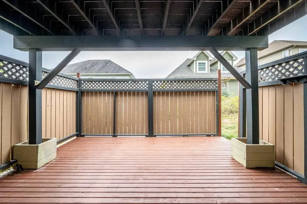 室外是双层露台以及全围栏的后院,适合开展各种室外活动,尤其下层露台栅栏全包,充分保证了私密性。
