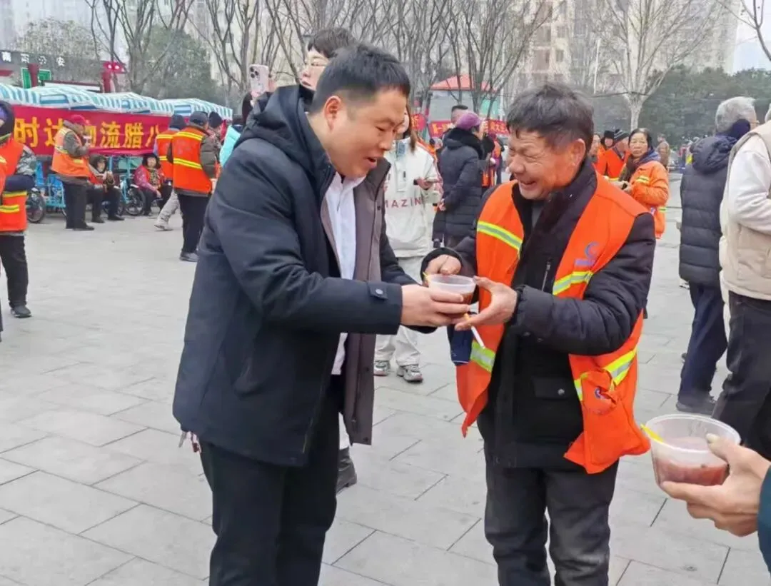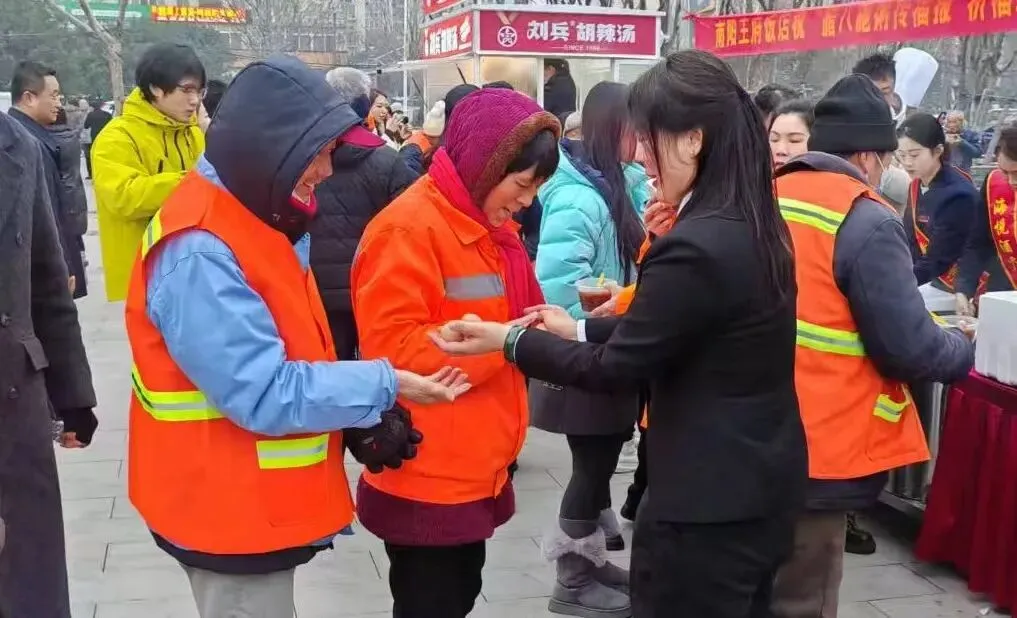 亿源地产人事经理王转,则端着热气腾腾的八宝粥与鸡蛋,配合着送棉被的节奏一一送到工人手中,柔声叮嘱:“先喝碗热粥暖暖胃,再把棉被带回家,干活冷了就裹上,可别冻着自己。”她瞥见一位大爷的手套破了洞,立刻从物资袋里取出新手套递过去,顺手帮他把棉被掖好,话语真挚而坚定:“你们守护城市的洁净,我们便守护你们的温暖。”