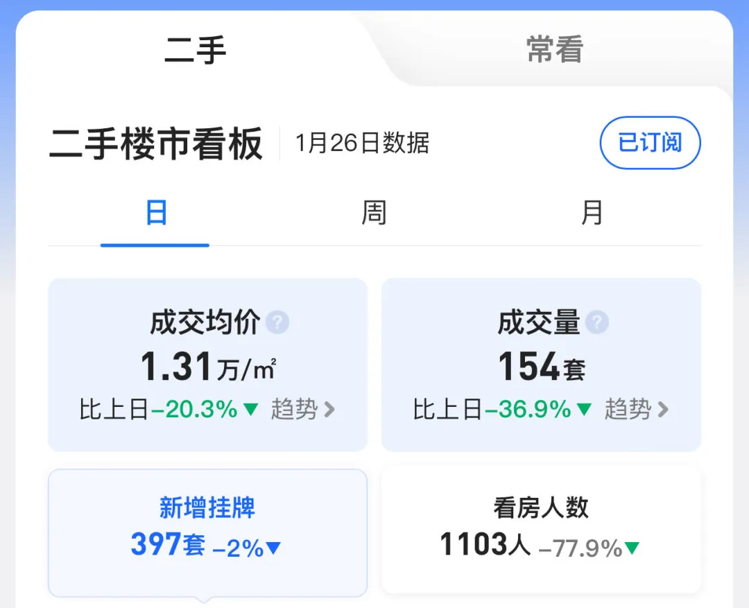 本月截至1月26日(周一),苏州六区住宅累计网签【4970套】,其中二手房累计网签【3988套】、新房累计网签【982套】。