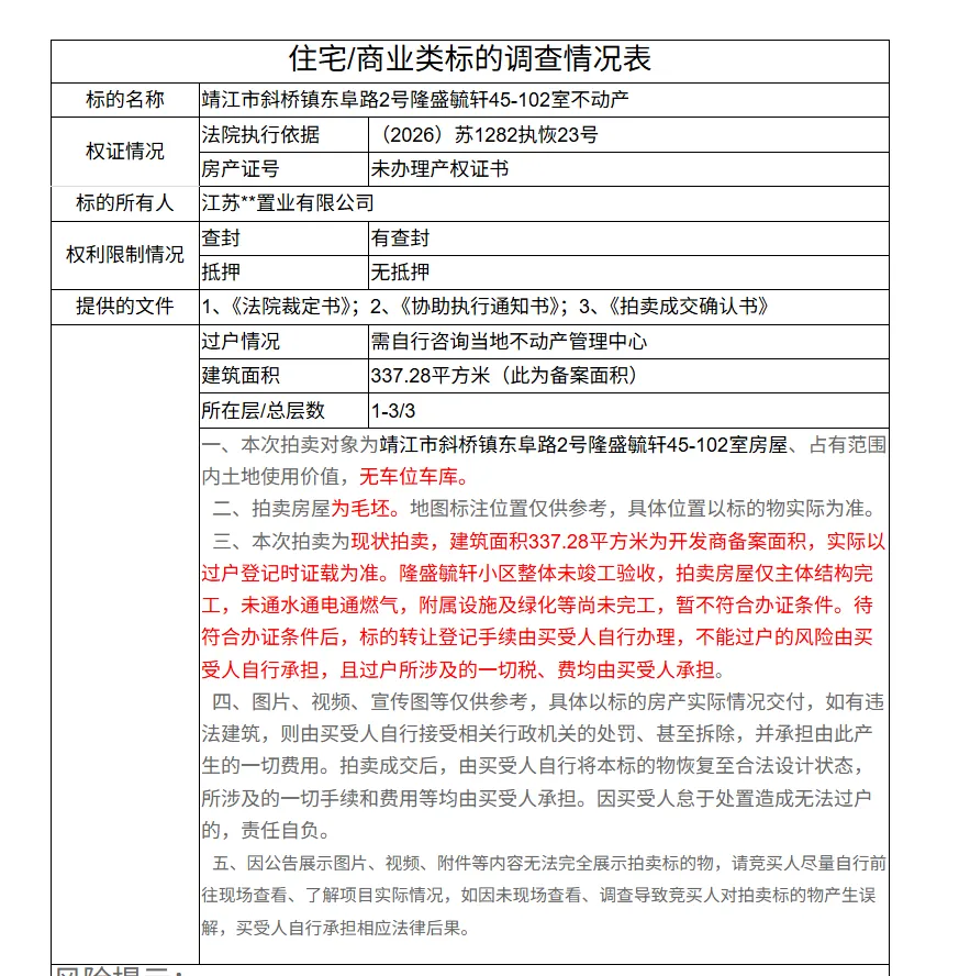 拍卖公告提醒:本次拍卖为现状拍卖,建筑面积为开发商备案面积,实际以过户登记时证载为准。隆盛毓轩小区整体未竣工验收,拍卖房屋仅主体结构完工,未通水通电通燃气,附属设施及绿化等尚未完工,暂不符合办证条件。待符合办证条件后,标的转让登记手续由买受人自行办理,不能过户的风险由买受人自行承担,且过户所涉及的一切税、费均由买受人承担。