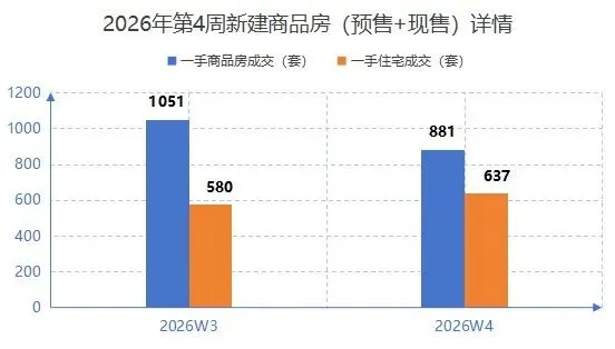 据深圳市房地产信息平台数据,2026年第4周全市新房(预售+现售)成交881套,环比下降16.2%。其中新建商品住宅成交637套,环比增长9.8%。