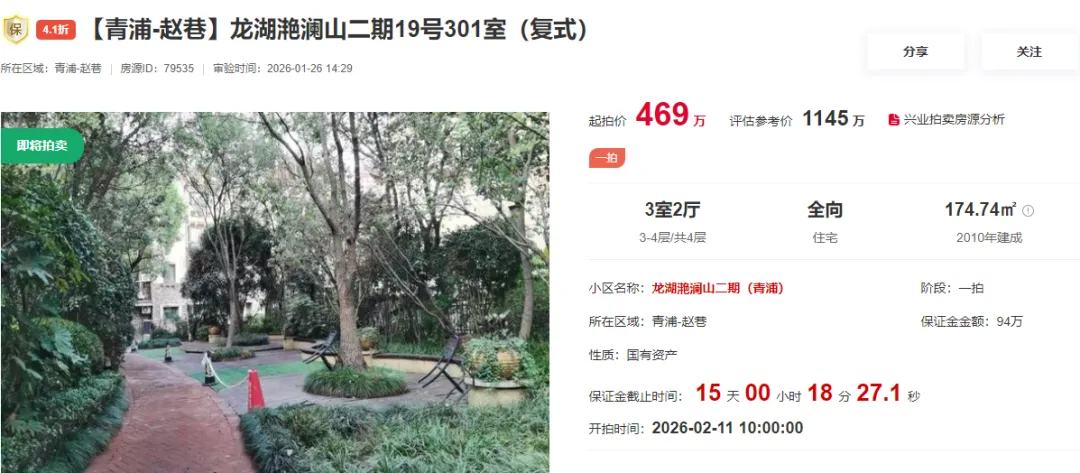本次拍卖房产6688弄19号的一套优质复式住宅,房屋建筑面积174.74平米,三室两厅多面采光,坐享佘山畔低密生态住区。现469W起拍,市场参考价格约1145W!