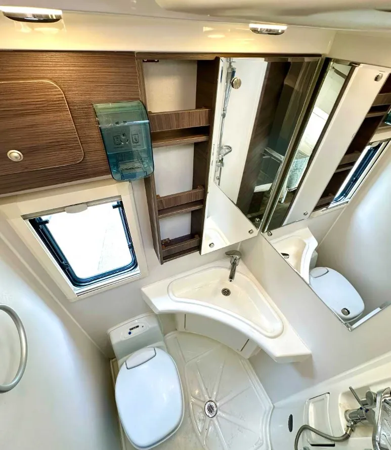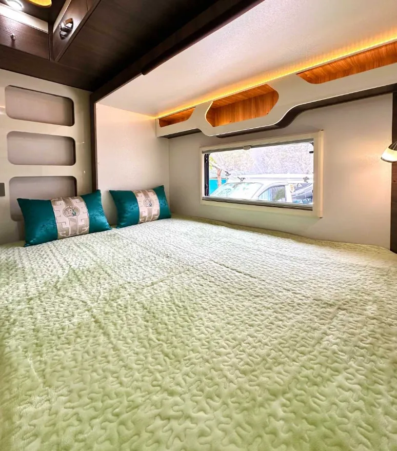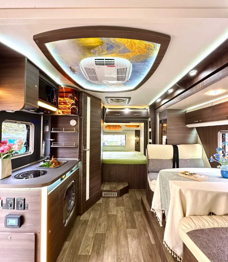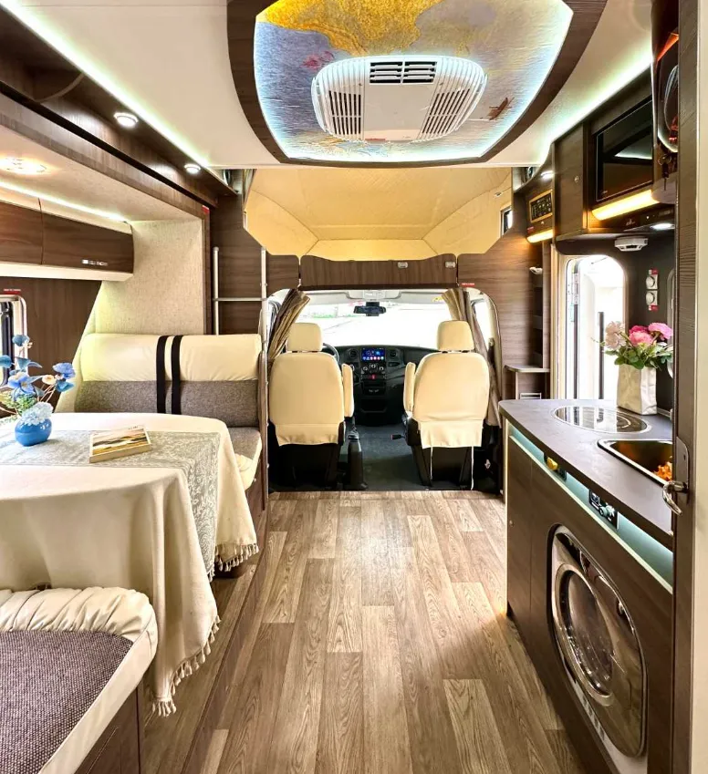 【上装配件】车载电视、顶置空调、双向换气扇、滚筒洗衣机、燃油暖风热水、五孔插座。微波炉、抽油烟机、电磁炉、洗菜池、车载冰箱、五孔插座。卫生间有抽拉马桶、面盆、淋浴花洒、梳妆镜、暖风出风口、双向换气扇、五孔插座。遮阳棚、电动踏步、充电口、加水口、取水口、三口杠、后挂备胎。