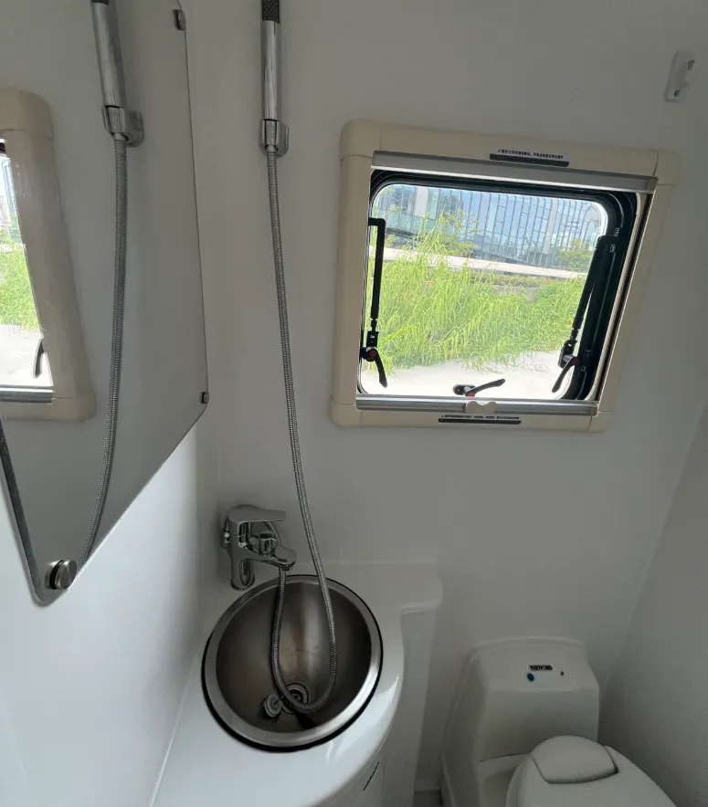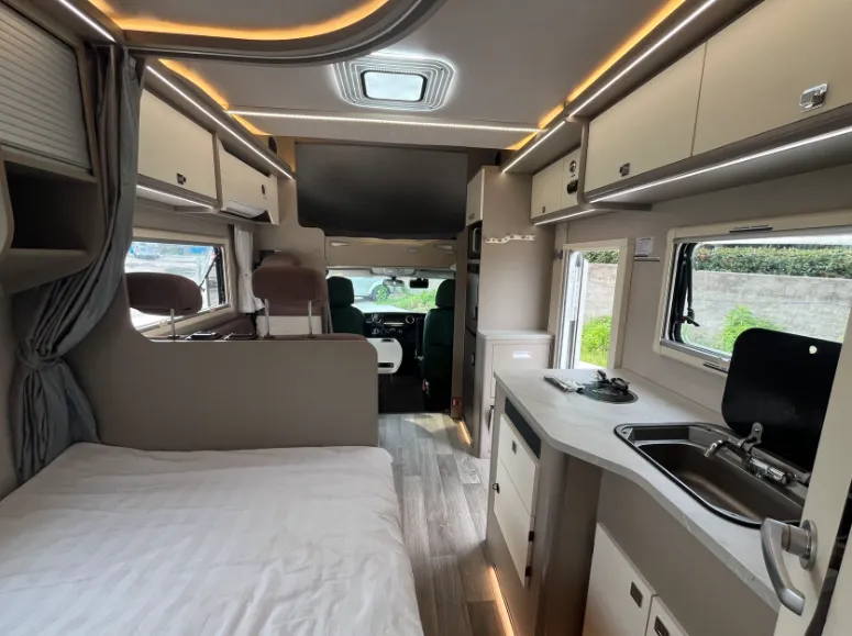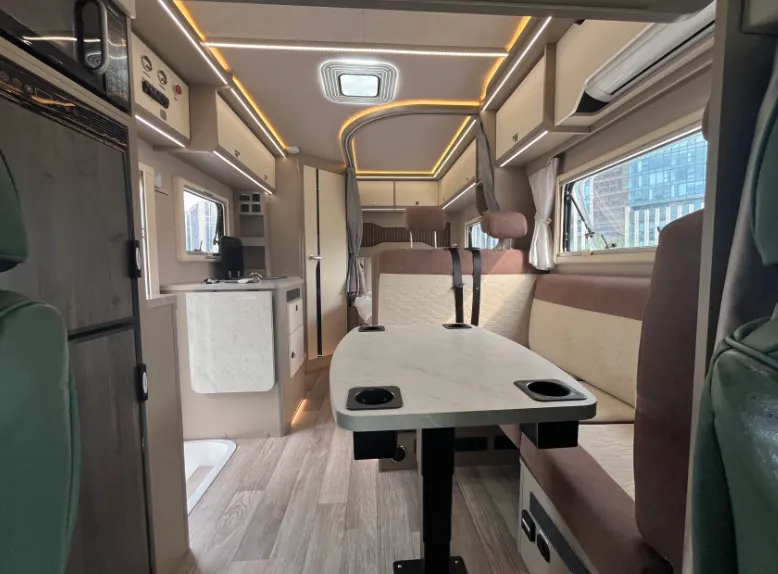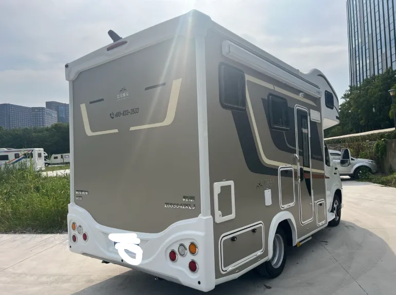 【上装配件】袋鼠仿生学大额头(玻璃钢);澳式双层高强度一体式副车架;黑钻前脸+高强度保温复合白色车身(铝板);环保生态板材家具+房车专用地板革、组合式橱柜,厨房、卡座吊柜+柜体内侧加置物绳;气动四向调节升降餐桌+布艺私密帘、纱帘;电磁炉+车戴微波炉系统;弗罗斯特150L冰箱双开门;外置抽拉燃气灶、房车专用带盖水槽+折叠水龙头;干湿一体式卫生间;赛特福德旋转抽拉马桶;整车电路+外接市电系统;机械式开关、LED灯条+阅读灯+车内氛国灯带+踢脚灯;房车专用户外LED灯;底盘应急启动系统;四路监控、家用变频空调(东芝)、10KW即热式柴油暖风热水一体机;卫生间顶置换气扇+卫生间暖风口、32寸网络智能电视+先锋音响系统;房车专用欧式中控乘客门带纱窗;迎宾灯上车扶手+电动踏步;左右侧外推窗、3M房车专用遮阳篷;预埋后爬梯、自行车架安装件;驻车手动支腿;备胎升降机构