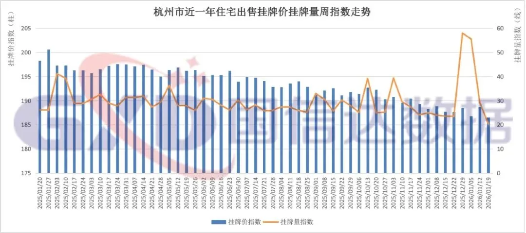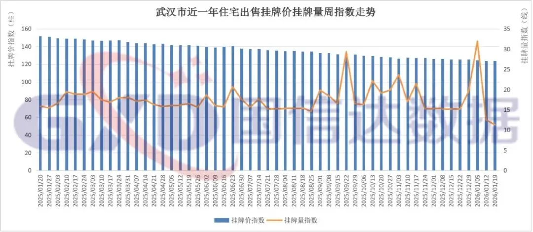 13个重点城市中近一年挂牌价、挂牌量周指数走势如下图: