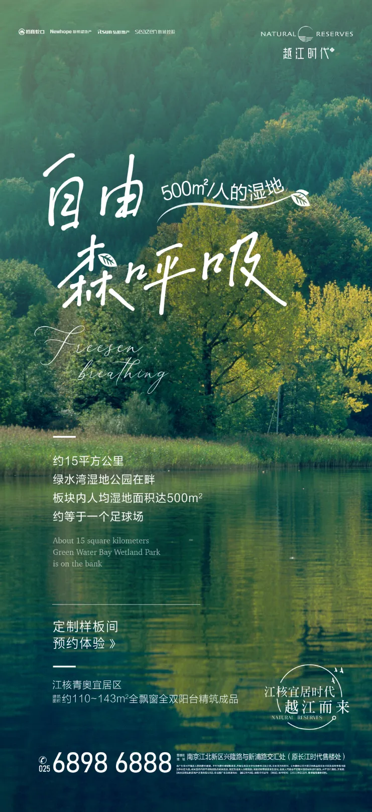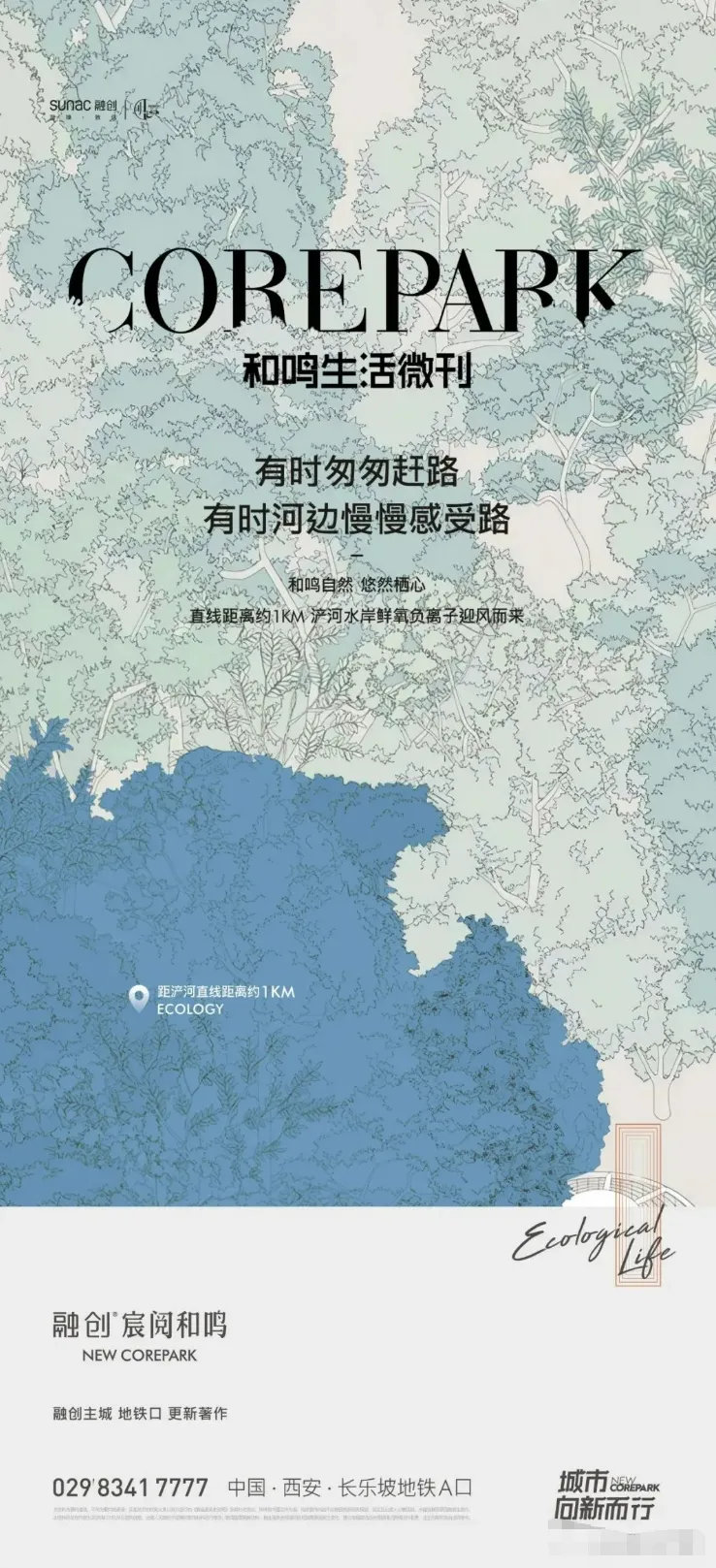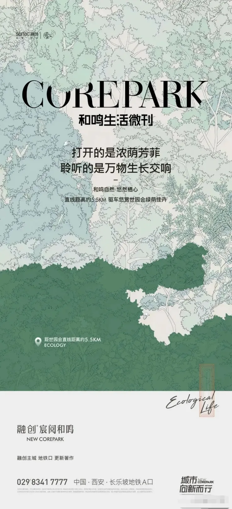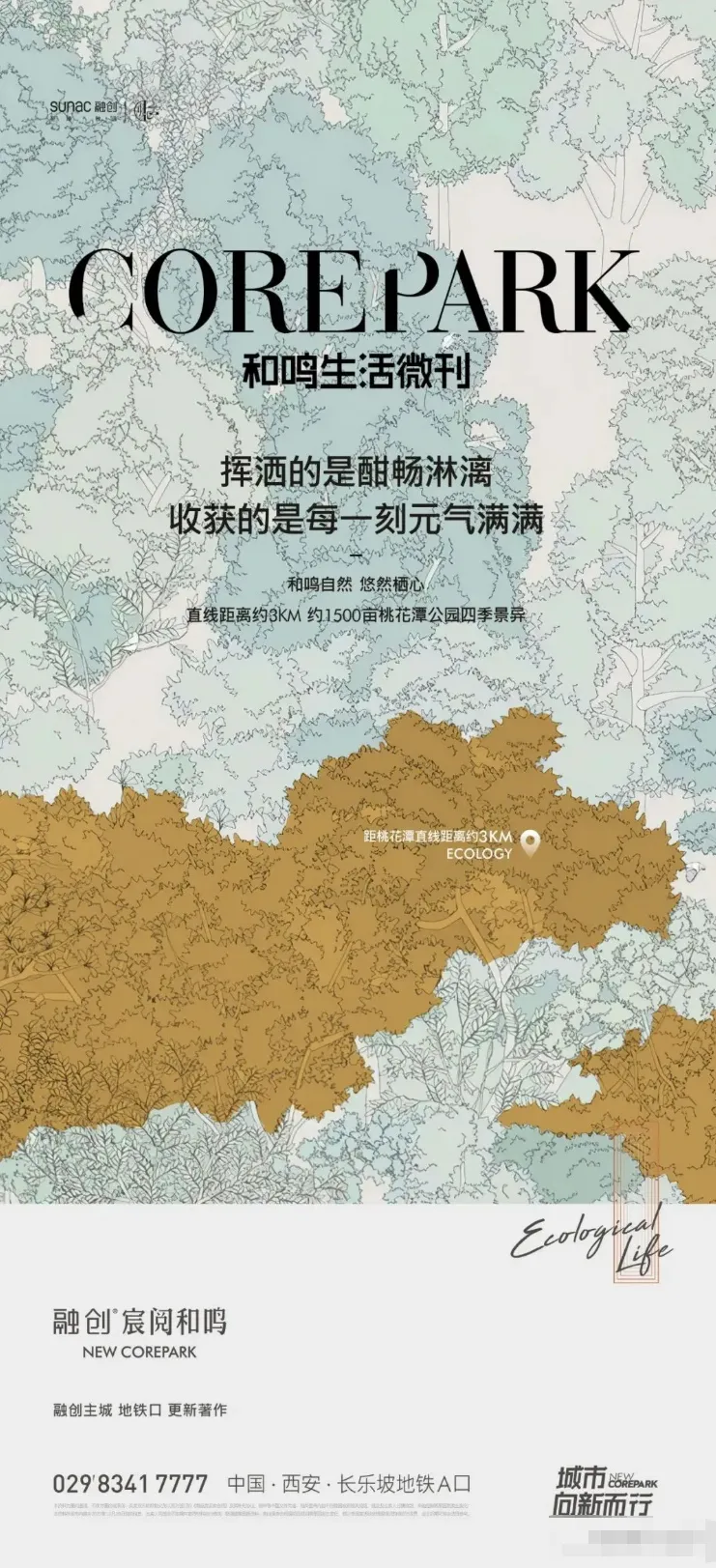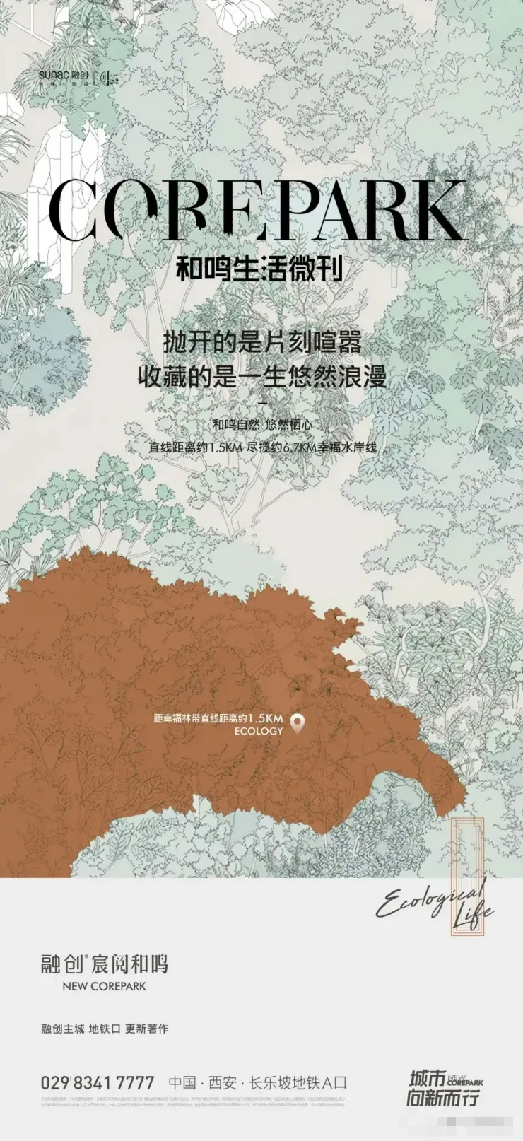 当都市生活被钢筋水泥包裹,这些海报却把森林、湿地与湖光揉进了画面里,成了无数人向往的 “精神出口”。它们没有硬塞配套参数,而是用诗意文案和细腻视觉传递生活质感:有的以手绘肌理还原浓荫芳菲的公园,有的用湖岸树影摇曳出四季情书,还有的把湿地写成 “500㎡/ 人的自由森呼吸”。