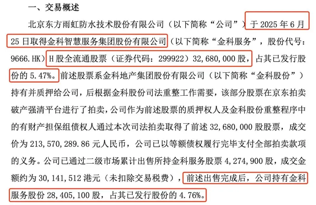 此次清仓并非临时起意,而是东方雨虹对金科服务股权的有序处置。回溯至2025年6月,东方雨虹通过司法拍卖获得金科服务3268万股股份(占其已发行股份5.47%),成交成本约2.14亿元,这些股份最初是金科地产用于抵偿欠款的资产。