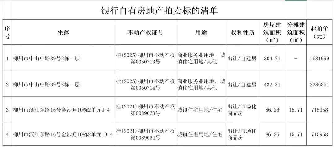 一、拍卖标的:中国农业发展银行柳州分行拥有的柳州市中山中路、滨江东路16号金沙角共4套房产,按套分别拍卖,详见以下标的清单。