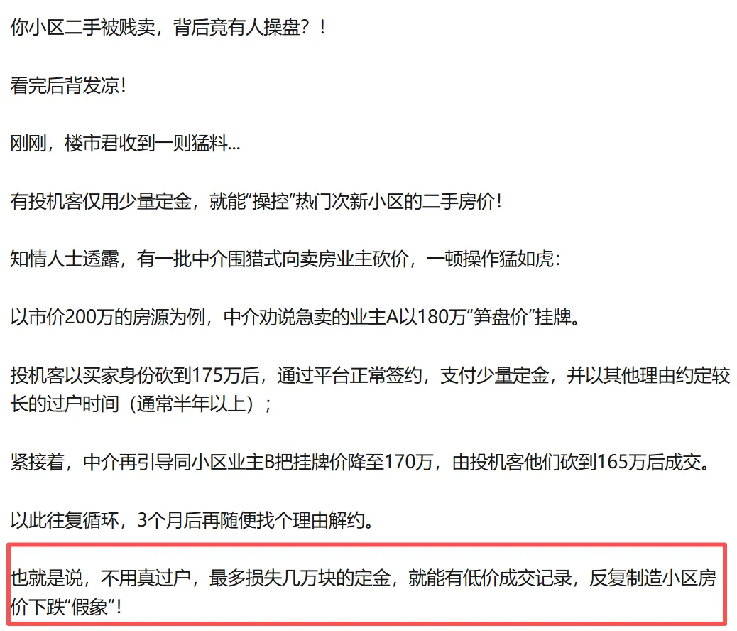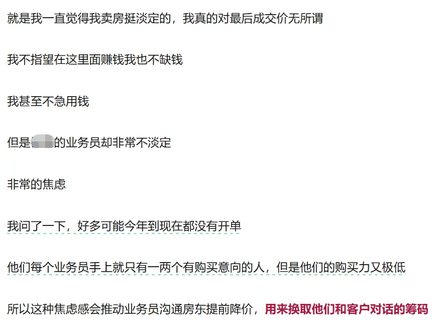 房东A说最近接到太多中介让他降价割肉,他实在不堪其烦,便下架房源转售为租了。房东B也遇到这样的情况。她说每次接到中介电话,常见的说辞是:最近你的小区又出了同一个户型,比你这套的价格低X万的房子。所以你不降价是卖不动的。“中介会说‘不差那几万块了,以后房价会跌更多。’我听到这句话,感觉像被中介PUA,心理就更逆反了,通常直接挂电话。”房东B这样说。今天,凤凰君不聊具体数据,我们聊下“体感下的珠海二手房市场”。前阵子,房产大V@真叫卢俊发了一篇文,讲述他卖二手房的感受。在一定程度上,卢俊代表了上文中凤凰君提到的业主:不急卖房,或者说不愿意贱卖房子。在与中介打交道的过程中,包括卢俊在内的这部分房东的感觉,是中介在设一个“局”,一个针对房东的“局”。因为如今是妥妥的买方市场,房东已沦为最没有话语权的那一方。若想促进交易,不断向房东施压、压低房价,就是撬动成交最快的方法。更夸张的是,凤凰君还在广州的房产大V上,了解到一个由投资客组的“局”,同样是围猎房东。就此事,凤凰君也咨询了珠海业内。得到的答复是,这股歪风并未吹到珠海。作为“弱势群体”,在面对不断下探的价格时,房东们除了选择不卖,更多的是“恐慌踩踏”。斗门某小区,均价2500元/㎡,跌回2006年;金湾某小区,亏损超60%出逃——如果是贷款的话,你甚至不知道他还要再借多少钱来还给银行,才能卖房。当然,以上提到的几个例子,并不代表全部的房东群体,也不能代表这个行业中介的做法。在二手房市场,有一个很不乐观的迹象:就是每套房子的成交价格,都会是下一套房子的价格上限。这种认知,不单推动着客户的购买价格预期;也推动着中介在谈判市场中向房东倒逼价格让步,以换取成交机会。对于房东而言,若资金紧张或者心理防线被打破,进一步地降价,以求快速出货,也是情理之中。而一旦小区中有一个房东下调价格,可能又会引起连锁反应……总的来说,凤凰君认为,不能单一说是房东不抱团,也不能简单说是中介推波助澜拉低市场价格,本质还是整体市场环境的下滑导致的。在交流中,有一位中介也做了另一个总结,凤凰君认为颇为一针见血:贪婪与恐惧这些人性,让本就下滑的市场,加速了进度。这两年,凤凰君也陆续与不少想卖房的房东聊过。也做过一些建议,不妨拿出来给大家参考:1、对于这两年配套兑现不理想的区域,在能接受的范围尽快出手。把不良资产尽量做整合;这个就不用多说了,比如斗门白蕉、金湾平沙等区域的市场境况,大家可见。现在资产的价值从核心区为原点向外递减,与其握着难变现的资产观望,不如及时置换到兑现力更强的核心板块,才能真正实现资产的优化配置。2、做好卖房准备后,尽量了解小区的房源价格(最好不是只通过中介渠道),房子好就比别人多加一点,屋况不好就比别人便宜一点。然后立好心态,不因个别中介的游说而随便下调价格。值得一提的是,凤凰君也了解到,现在的市场上,尽管房客选择好价格,但是并不意味着同一个户型只取最低价格。尤其对于改善买家而言,楼层、景观、位置、装修保养,还有附加的车位等等,都会决定最终的买单价格。3、每个行业都有参差不齐的从业人员,尽量多接触几个中介,从他/她对你的反馈考察其对市场的认知与思考,选择一个客观的中介作为你卖房的军师,在卖房过程中也会更顺心。