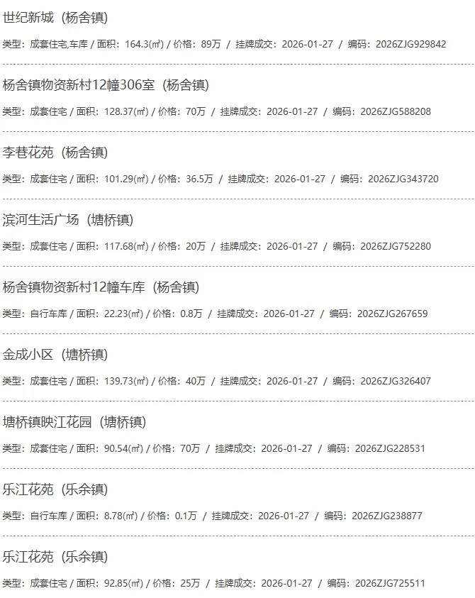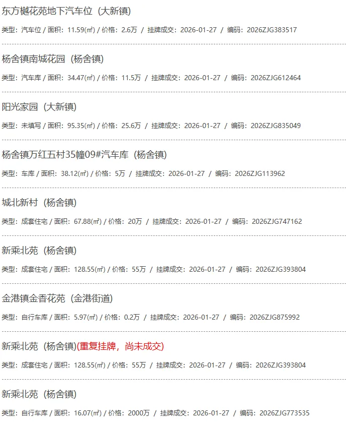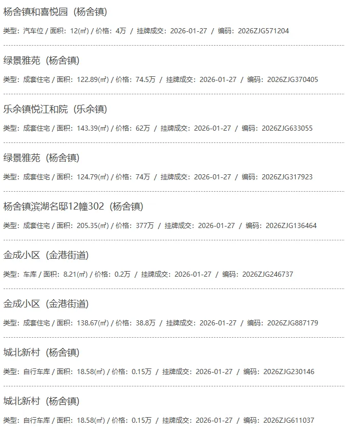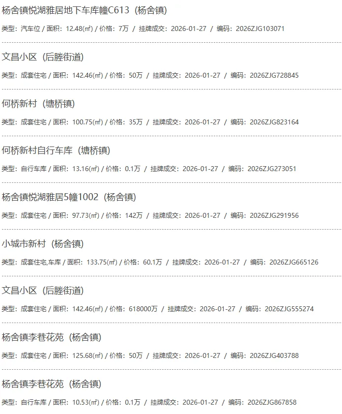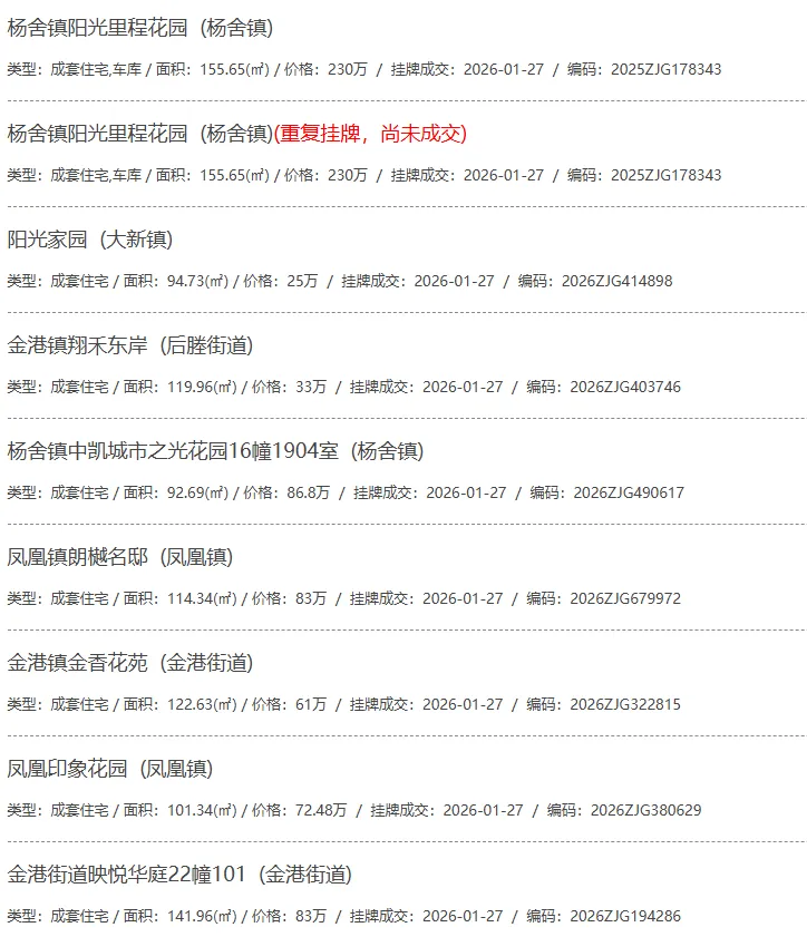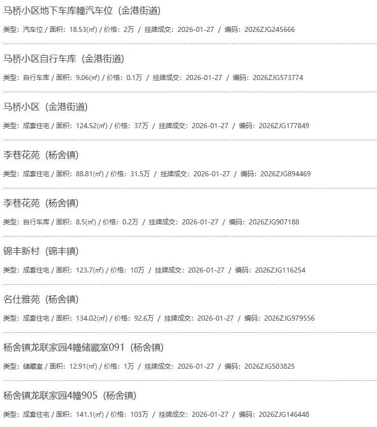根据张家港房产网(www.zjgzf.cn)整理,(2026-01-27至2026-01-27)总共52套二手房网签挂牌成交(含自行车库及汽车库),数据根据住建局官方网签平台整理,并已同步至各对应小区的成交明细,特别提醒:此处数据及各小区成交数据中凡标注(来自网签挂牌)的,均是根据政府网签挂牌系统整理,价格可能不准,请谨慎采信;并仅作为您买房卖房的参考而非决定依据。以下为数据明细: