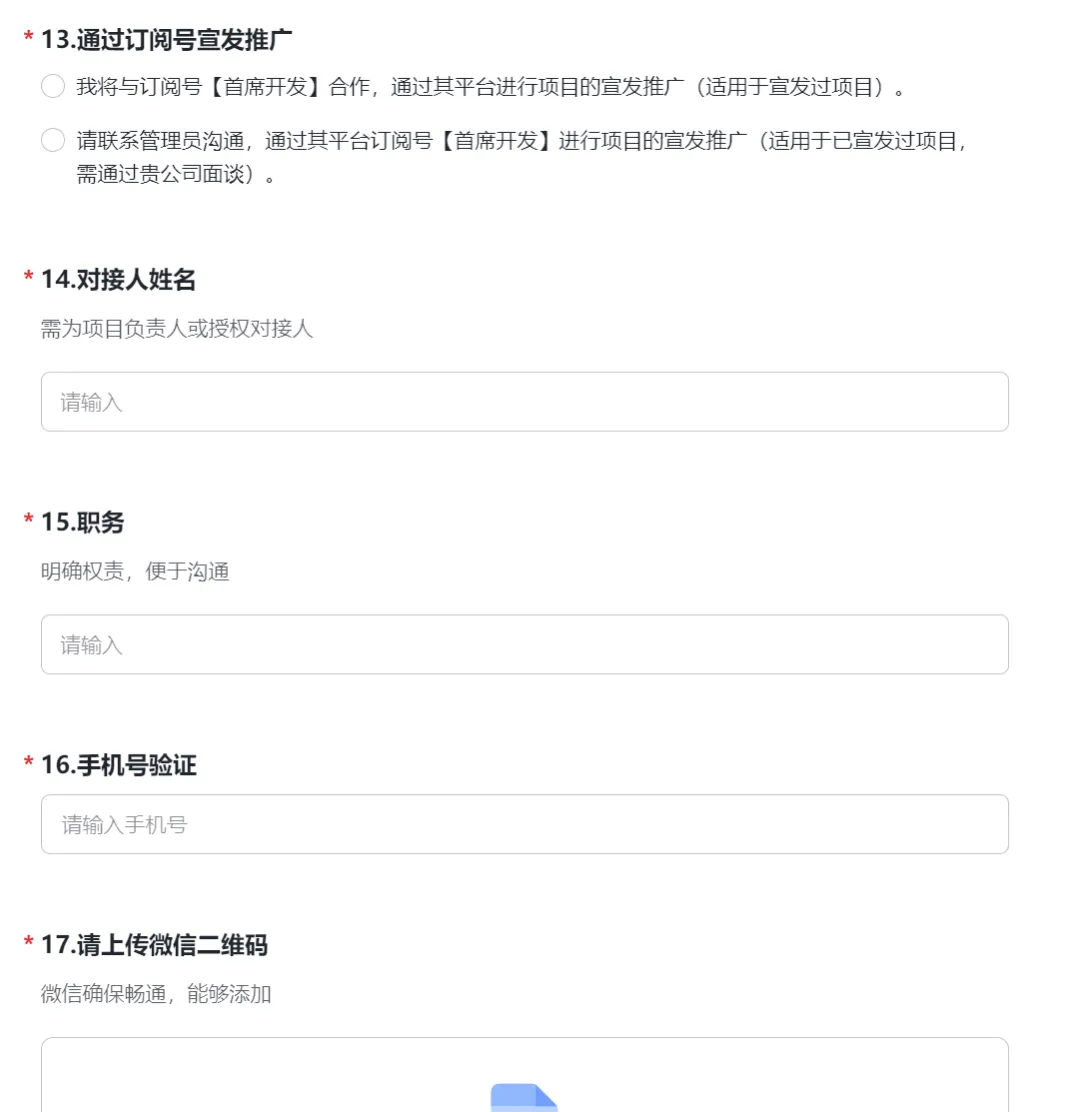 确认宣发的用户,我们将在按登记的时间顺序进行宣发,前端联系方式只提供:微信二维码,不展示手机号。