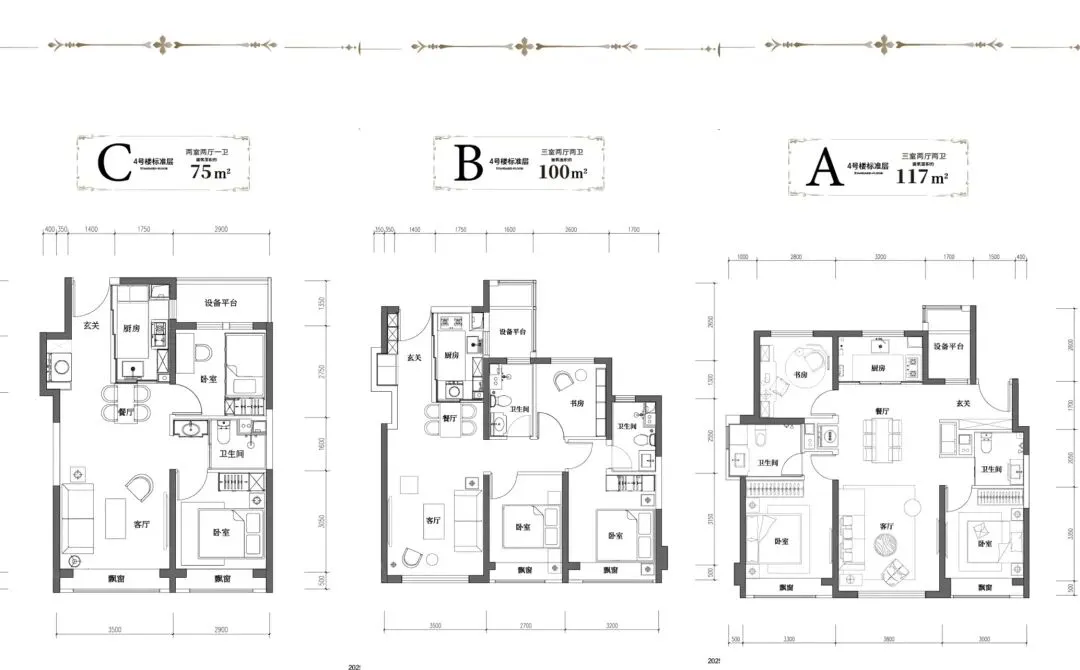 目前二期在售的4号楼,有三种户型75平两室,100平的三室和118平的三室,户型基本和一期保持一致。据阿拉丁的小道消息二期后面还会有68平的两室和140平的四室,更小的两室让您入门预算更低,更大的三室满足高端改善对面积的要求。