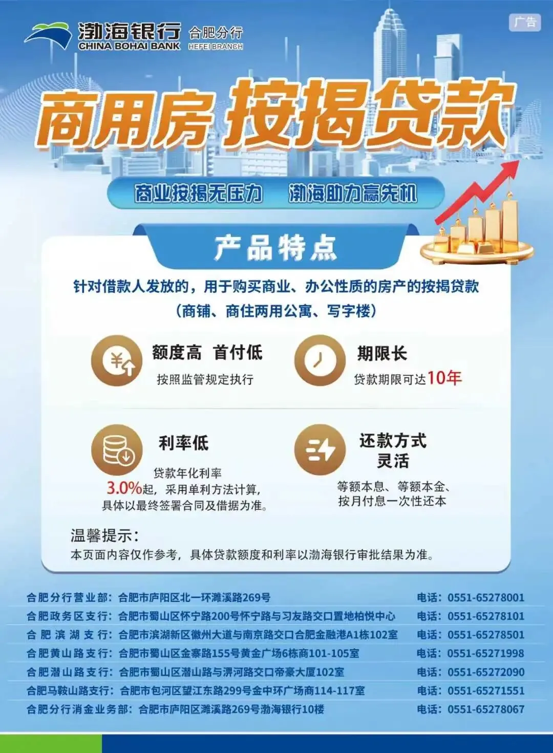 2026年1月15日,中国人民银行新闻发言人、副行长邹澜在国新办发布会上透露,会同金融监管总局将商业用房购房贷款最低首付比例下调至30%,支持推动商办房地产市场去库存。 合肥目前支持商业用房按揭的银行主要有:南洋商业银行、渤海银行、平安银行。新政出台后,渤海银行已经落地具体的商办政策更新。仅供参考,具体额度和利率以银行审批结果为准: