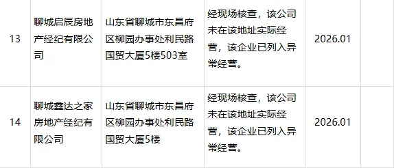 聊城市住房和城乡建设局发布了《2026年1月份聊城市房产经纪机构及住房租赁企业风险警示名单》。此次共有14家企业及个体工商户被列入名单,主要涉及“退定金、押金、租金难”、服务质量不达标、投诉处理不及时,以及未在注册地址实际经营、未按规定报送开业及房源信息备案等突出问题。。