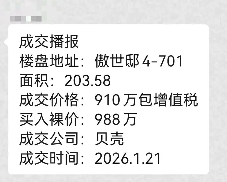 中介发文中并没有透露实际价格,只表示“亏本金成交”。查阅资料显示,该套房源买入裸房价为988万。有网友算了一笔账,算上贷款利息三年约80多万,3%增值税约30万,再加上本金亏损约78万,另外还有其他物业费、契税等费用。如果成交价格为真,粗略估算,业主亏损预计超200万。