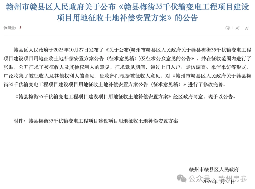 近日,赣州赣县区政府官网发布了"关于公布《赣县梅街35千伏输变电工程项目建设项目用地征收土地补偿安置方案》的公告"。