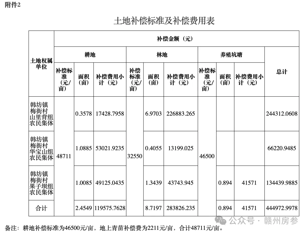 地上青苗、树木、生产生活设施等的补偿标准按照《赣州市赣县区人民政府关于公布征地地上青苗补偿标准的通知》(赣区府字〔2024〕44号)执行,具体补偿标准及金额见附件3。