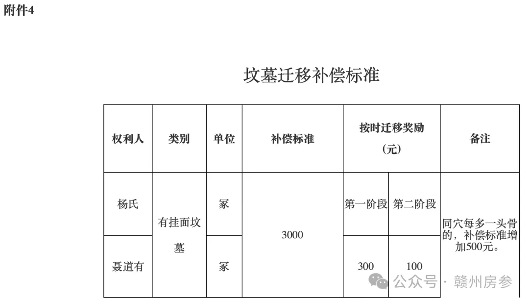 按时迁移坟墓,给予补偿和奖励(详见附件4),无主坟墓由实施单位负责迁移。征收范围内迁移的坟墓应当迁往政府统一建设的坟墓安置点集中安置。