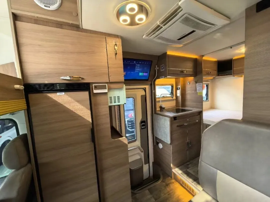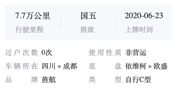 【车辆名称】:旌航巍豪依维柯C型房车【上牌时间】:2020年6月【公里数】:7.7万公里【过户情况】:个人一手【底盘名称】:依维柯欧盛【动力】:F1C3.0T柴油发动机【驱动方式】:前置后驱【变速箱】:采埃孚8AT自动挡【排放标准】:国五排放【核载人数】:5人【车身尺寸】:长:5995宽: 2375 高:3150【水电配置】:1200Ah锂电池,3000W逆变器,800W太阳能,220L清水箱,60L灰水箱【电器配置】:多美达双转子变频空调,152L塞特福德冰箱,驻车燃油暖风热水一体机,智能网络电视,富森功放,富森音箱,大宇微波炉,mini3Kg洗衣机【卫生间配置】:独立卫生间,塞特福德抽拉马桶,淋浴花洒,洗漱盆,毛巾架,卫生间换气扇【户外配置】:电动踏步,多美达户外遮阳棚,户外抽拉燃气灶,户外加水口,防蚊纱帘,三口拖车杠【其它配置】:多功能方向盘,倒车影像,中控大屏,四轮氮气减震。