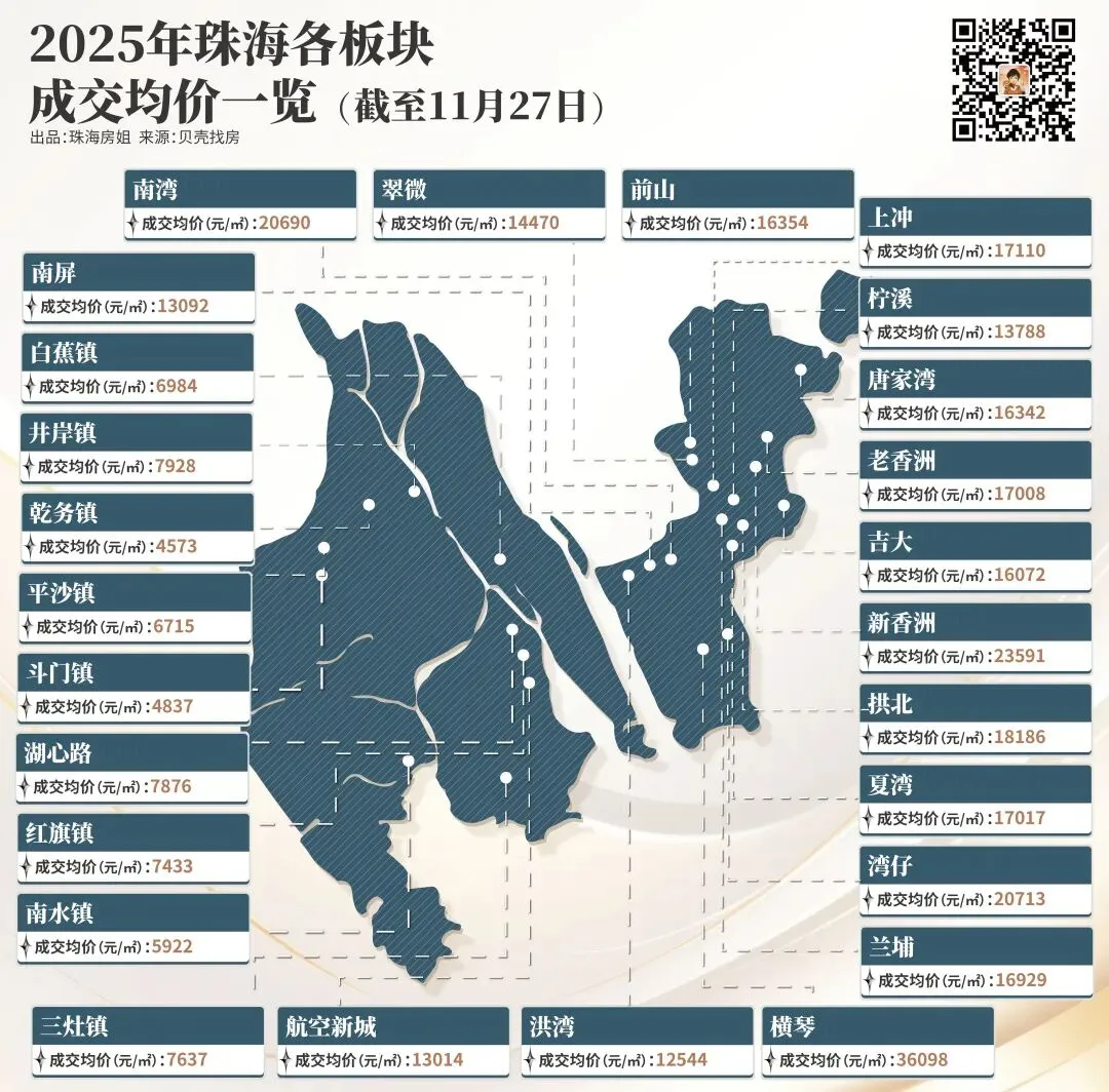 其中,均价最高的依然是横琴,为36098元/㎡,领跑全市;其次是新香洲,为23591元/㎡;
