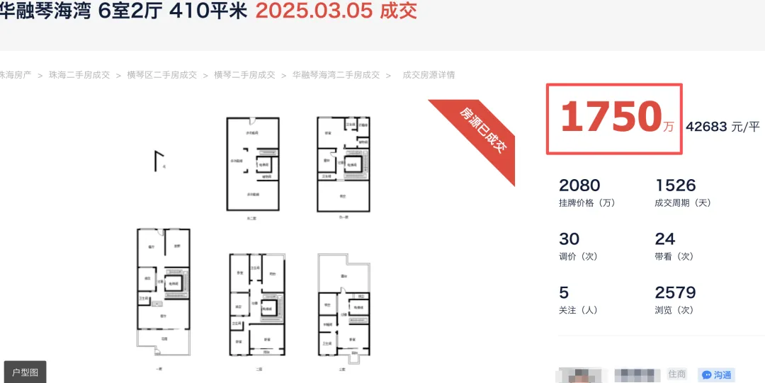 其次是中信红树湾,南区一套约319.88㎡五房两厅单位以总价1620万成交。
