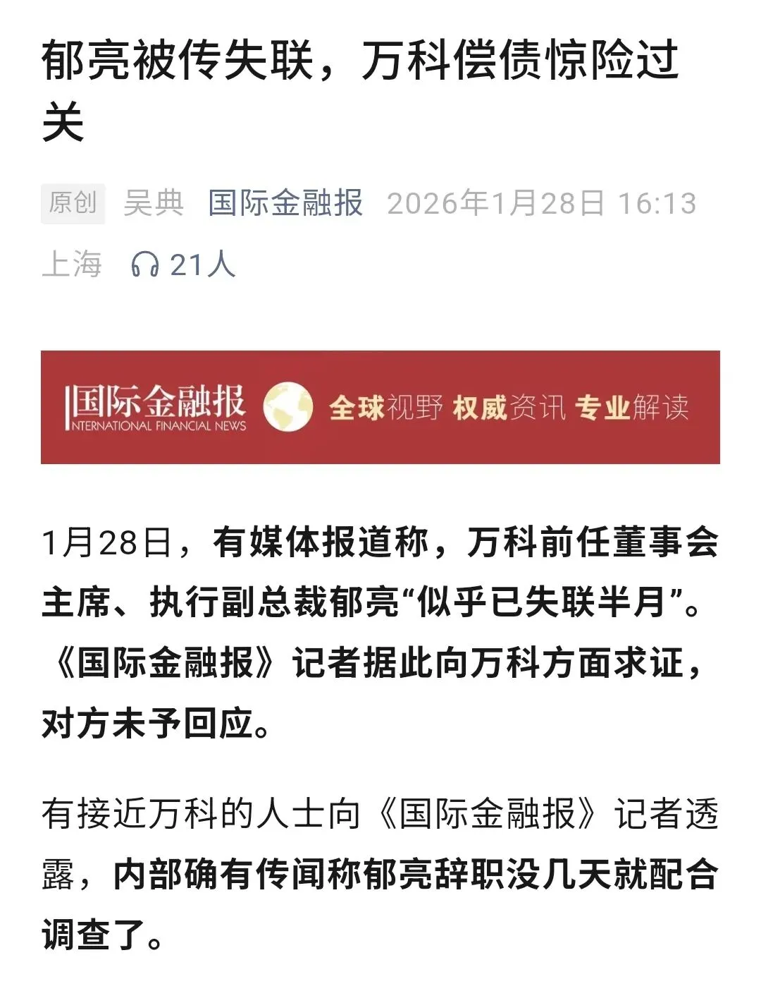 值得注意的是,郁亮并非万科近期唯一“失联”的核心高管:2025年深铁派驻的万科董事长辛杰参会期间被传带走,总裁祝九胜被采取刑事强制措施。