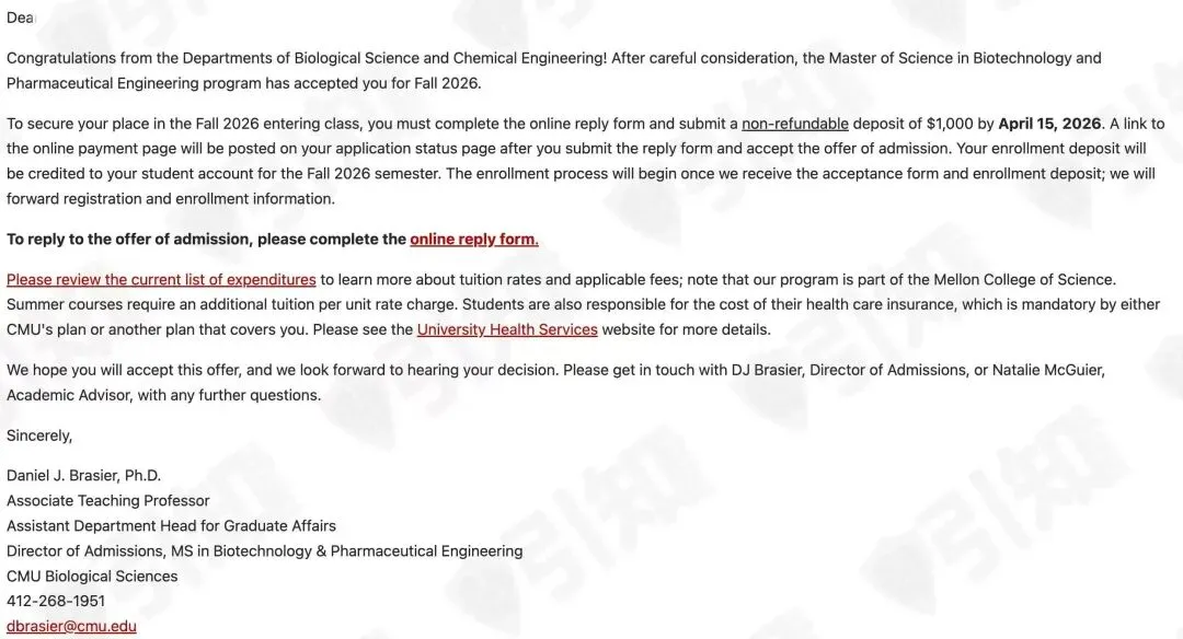 【CMU】定量生物学与生物信息学硕士录取!