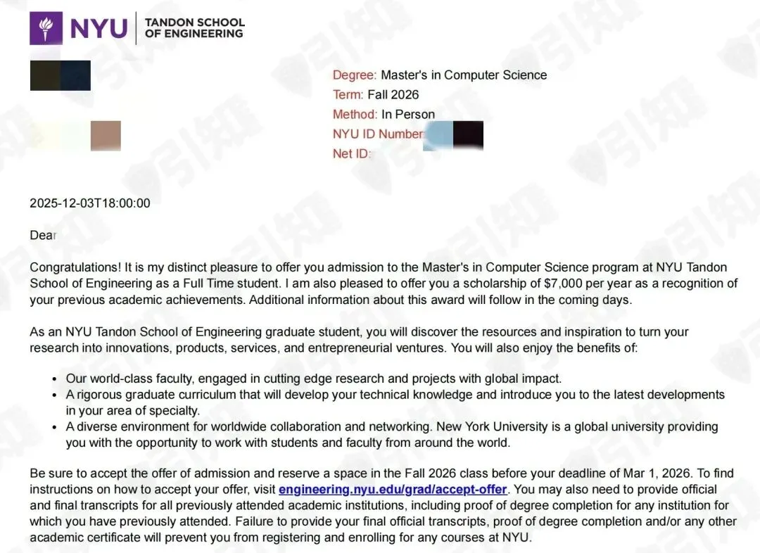计算机科学硕士项目录取!