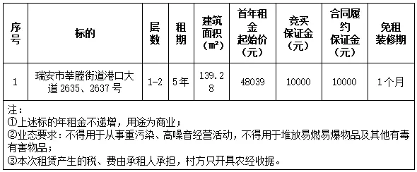 受委托,定于2026年1月26日上午9时30分,在瑞安市安福路30号瑞安市农村产权服务中心一楼拍卖大厅,将对以下标的物租赁权进行拍卖,现公告如下: