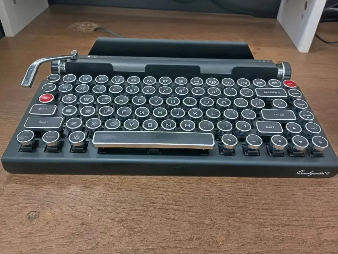 笔记本电脑外接显示器之后,再使用笔记本键盘打字就很别扭。因为屏幕大,肯定是把外接显示器当主屏,但正对着的是笔记本屏幕。所以就想着再配一把机械键盘。现在外设也是贵得没边了,很多客制化键盘都是千元起步,几万块的也不新鲜。当然还是小破站上那些复古造型、圆形键帽的机械键盘深得我心。然而选择也不是很多,这个京东京造&Qwerkywriter S复古打字机机械键盘看着还不错。最后就是在小黄鱼扫货了。