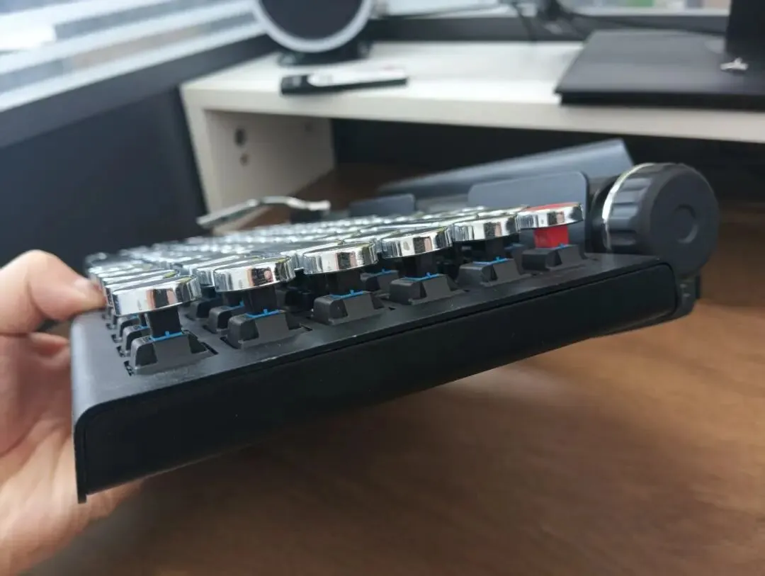 这款键盘虽然造型奇特,但很实用。左侧金属宏编程回车拨杆算是点睛之笔,可以在拨动拨杆同时按FN键进行自定义编辑15个字符。尤其在写报告的时候,很多重复输入的内容(比如比较拗口的名称)拨动一下可以自动输入。不设置输入字符的话是默认的回车键功能。