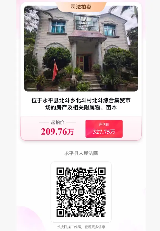 一、拍卖标的:位于永平县北斗乡北斗村北斗综合集贸市场的房产及相关附属物、苗木;房屋建筑总面积为:551.97平方米(包含框架结构住房1幢,房屋总层数2层,建筑面积为283.11平方米;框架结构门市部1幢,房屋总层数1层,建筑面积为103.65平方米;框架结构综合用房1幢,房屋总层数2层,筑面积为165.21平方米;)。土地使用权面积:1007.17平方米,性质为住宅用地,土地使用权终止日期:2071年10月12日。